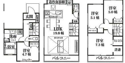 | 間取内容 | LDK・・・19.8帖 居室・・・7.3帖・5.1帖・5.0帖・4.7帖 ウォークインクローゼット・書斎 |
