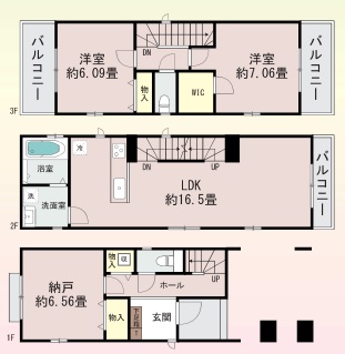 間取内容 | LDK・・・約16.5帖 洋室・・・約7.06帖・約6.09帖 納戸・・・約6.56帖 |