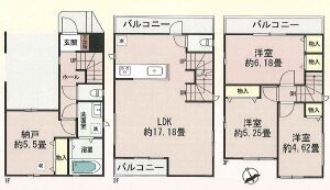 | 間取内容 | LDK・・・17.18帖 居室・・・5.18帖・5.25帖・4.62帖 納戸・・・5.5帖