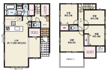 | 間取内容 | LDK・・・約17.2帖+約3.5帖 洋室・・・約9.0帖・約5.3帖・約5.2帖・約4.3帖 | ||