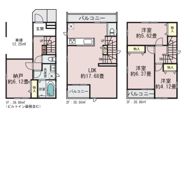 | 間取内容 | LDK・・・17.68帖 洋室・・・5.62帖、6.37帖、4.12帖 納戸・・・6.12帖 |