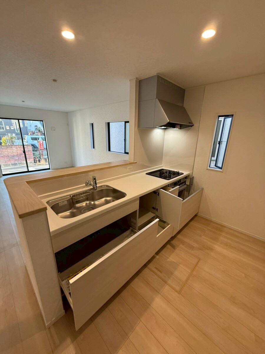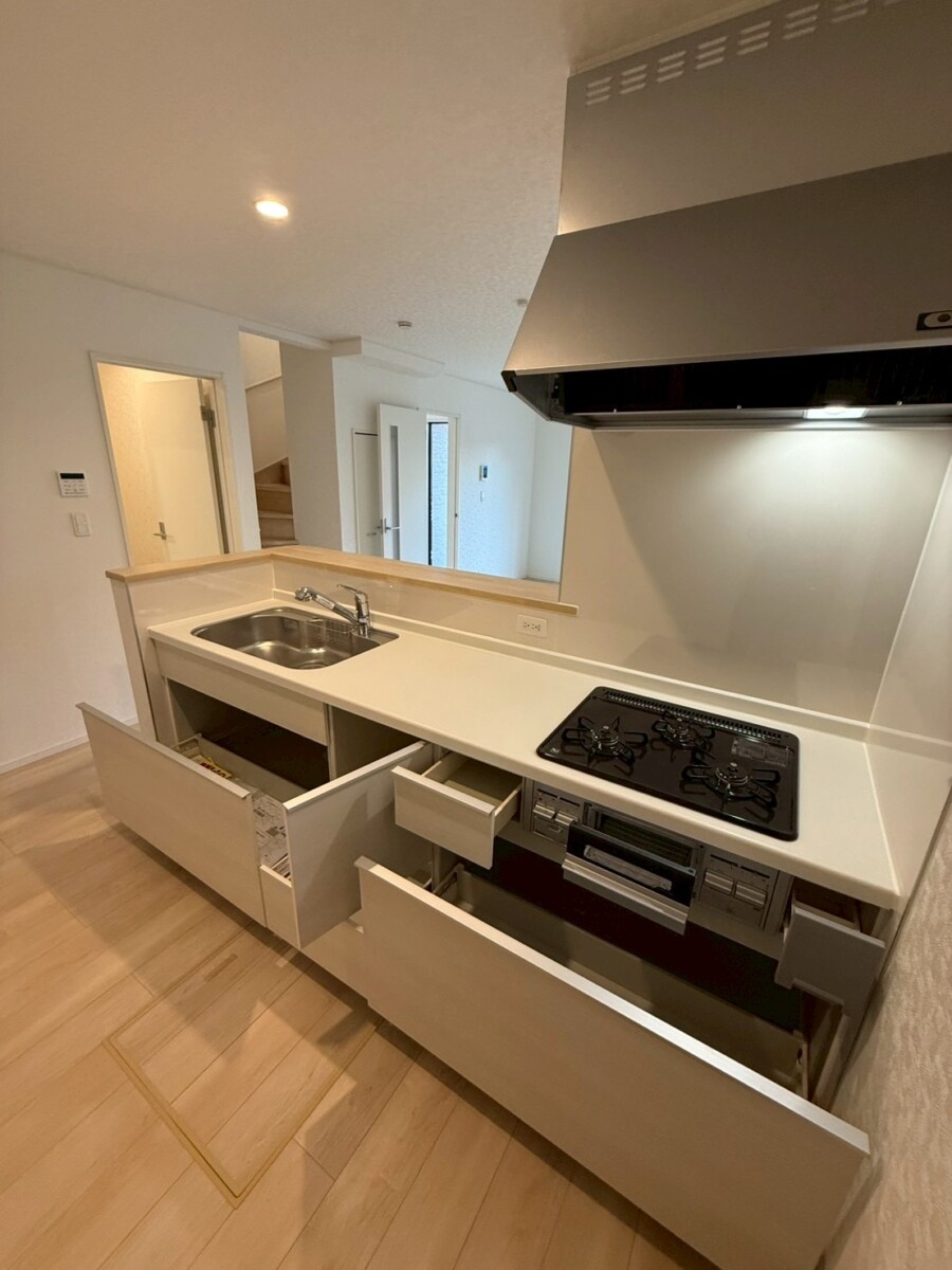 使用:システムキッチン、TVモニター付きインターフォン、3口ガスコンロ、シャンプードレッサー、浄水器一体型シャワー水栓、防犯カメラ、人感センサー付き玄関灯、シャワートイレ、防犯カメラ、24時間換気システム |
