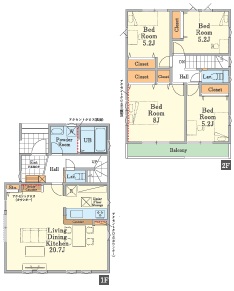 | 間取内容 | LDK・・・20.7帖 洋室・・・8帖・5.2帖・5.2帖・5.2帖 |